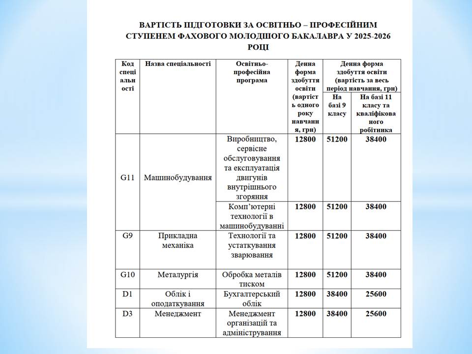 • Вартість навчання